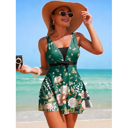 Damen Badeanzug Tankini Rock Bademode Elegant Urlaub Blumen Grafik V Ausschnitt Ärmellos Badeanzüge