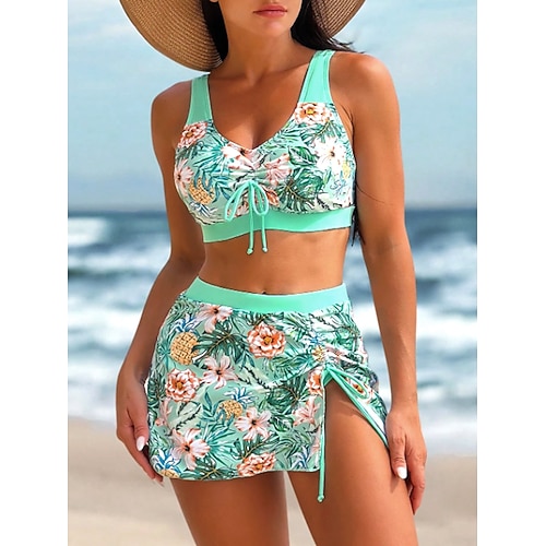 Damen Tankini 2-teilig Badeanzug mit Rock Rock Rückenfrei Urlaub Strandbekleidung Floral Grafik V-Ausschnitt Ärmellose Badeanzüge