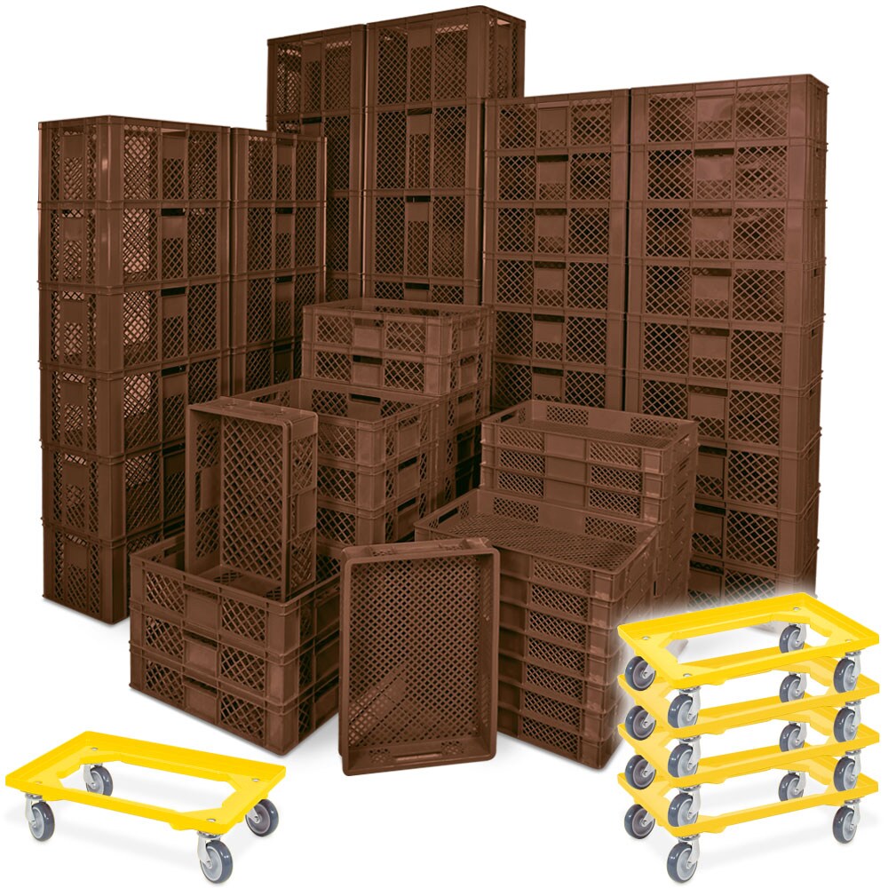 BRB 78 Bäckerkisten in 5 Größen, 600x400 mm, H 90 mm - 410 mm, braun + 5 Roller, gelb