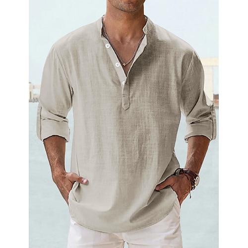 Per uomo Camicia Camicia di lino Camicia popover Camicia Estiva Abbigliamento da spiaggia Maglia Henley Tinta unica Vacanza Casa Rosa Azzurro cielo Verde Cachi Manica Lunga Collo alla coreana Estate