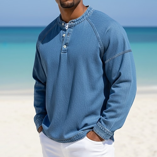 Per uomo Maglietta Maglia Henley Camicia 100% cotone lavaggio acido Manica Lunga Collo alla coreana Henley Estate Primavera Autunno Semplice Vintage Streetwear Casual Lavato Manica corta Casuale Casa