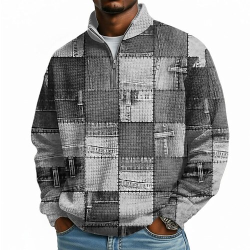 Per uomo Geometrico Plaid Nido d'ape Felpa Moda Quotidiano Classico Casual Collo alla coreana Zip a un quarto All'aperto Casa Ufficio Lavoro Blu Arancione Verde Grigio Con zip Autunno Inverno