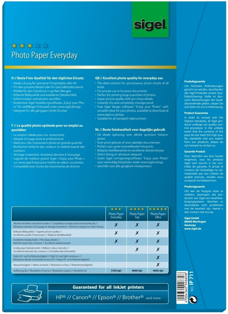 Sigel Fotopapier Inkjet Everyday Plus A4 200g/qm weiß glänzend VE=20x50 Blatt