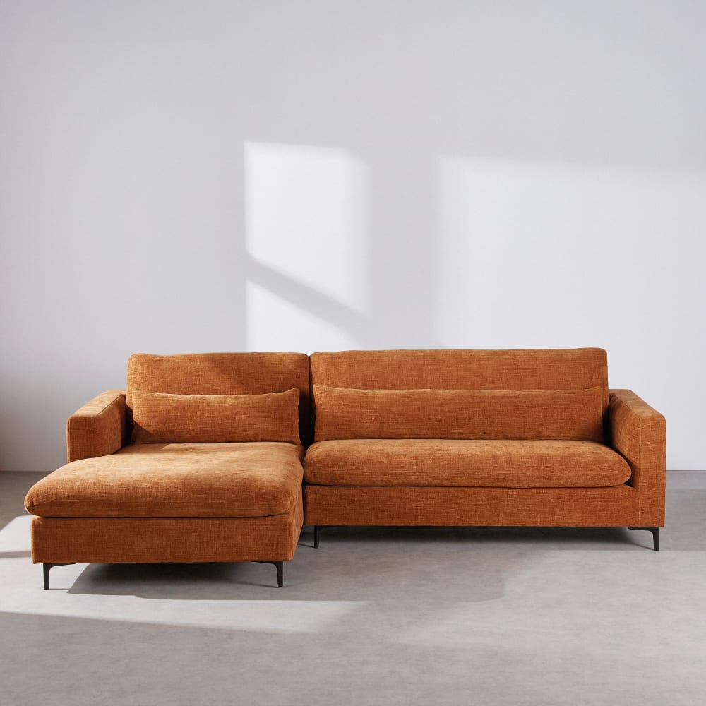 Divano angolare con penisola a sinistra 4/5 posti con poggiatesta effetto velluto color mattone