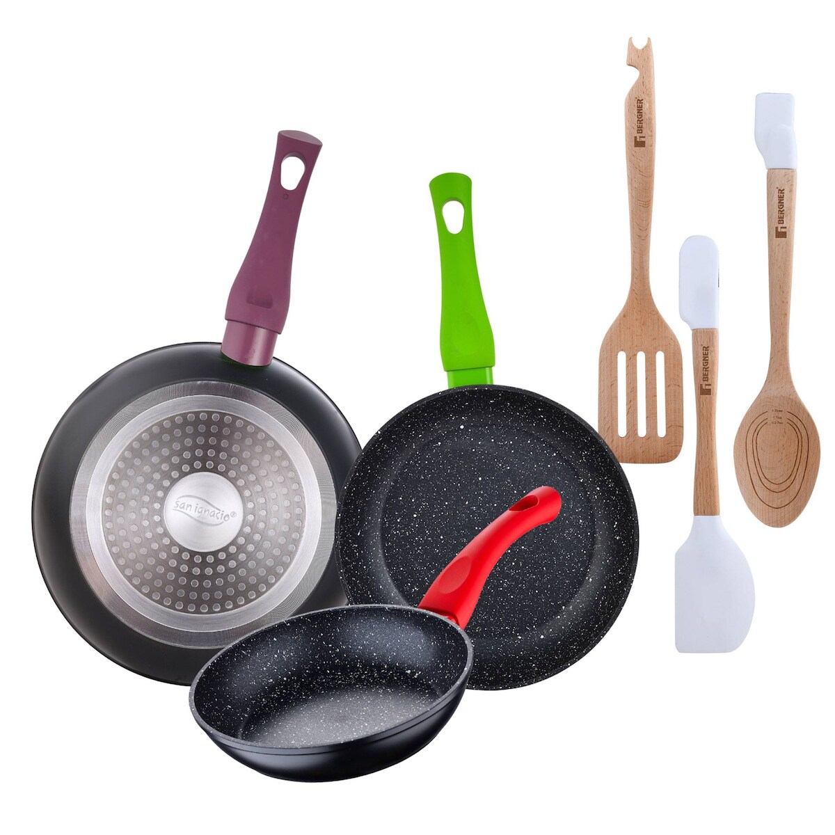 BERGNER - Set aus 3 Pfannen Ø18/Ø22/Ø26 cm Jolie Schmiedaluminium, geeignet für Induktion Set 3 Utensilien aus Silikon und Holz