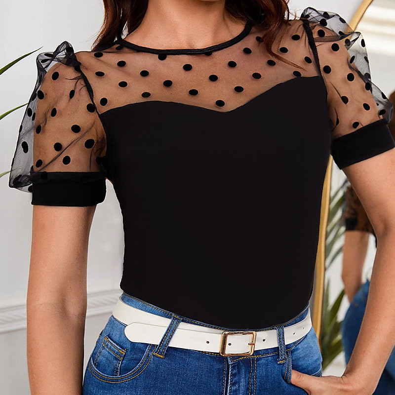 Women's T Shirt Tee Top Polka Dot Stylish Casual Short Sleeve Round Neck Regular Tops Daily Going out Weekend Patchwork Mesh Black White Summer