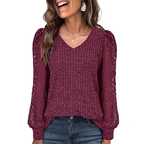 Per donna Maglietta Top con cuciture in pizzo Tinta unica Elegante Moda Carino Manica Lunga Girocollo Scollo a V Top Regolari Quotidiano Uscire Weekend Pizzo Patchwork Nero Bianco Vino Verde militare