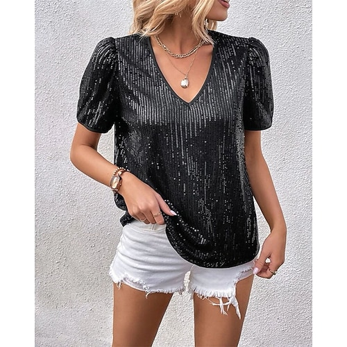 Per donna Maglietta Top estivi Tinta unica Elegante Moda Sexy Manica Corta Girocollo Scollo a V Top Regolari Quotidiano Uscire Weekend Paillettes Patchwork Nero Bianco Bianco sporco Estate Primavera