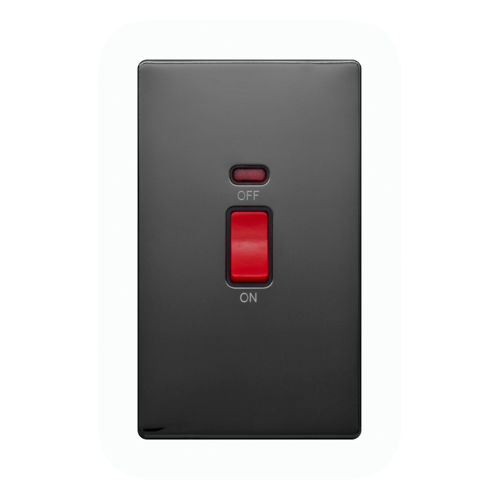 Lieber Black Nickel 45A 1 Gang Double Pole Switch & Neon - Large Plate - Black Insert Screwless - Size: 146mm x 86mm x 3.1 mm