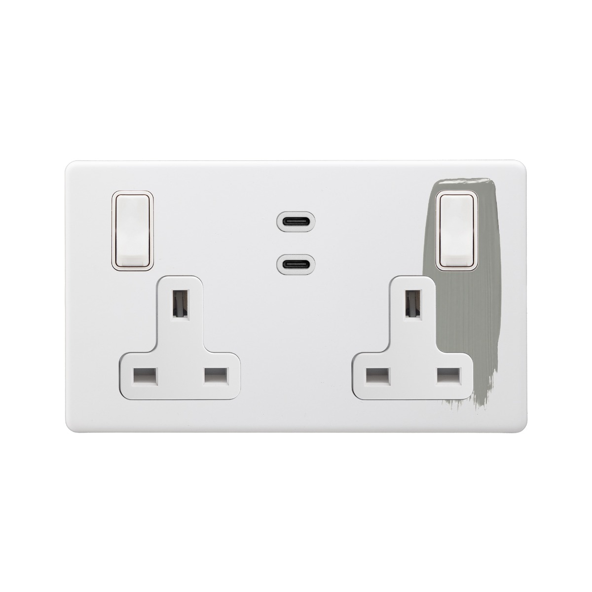 Soho Lighting Primed Paintable 2 Gang 65W USB C+C Socket (13A Socket + 2 USB C Ports) with White Switch - Size: 86mm x 146mm x 4.5mm
