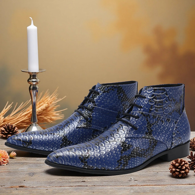 Men's Blue Snake-Patterned Leather Boots with Metallic Toe Cap – Trendy, Stylish Design, Perfect for Evening Events and Fashion Forward Looks