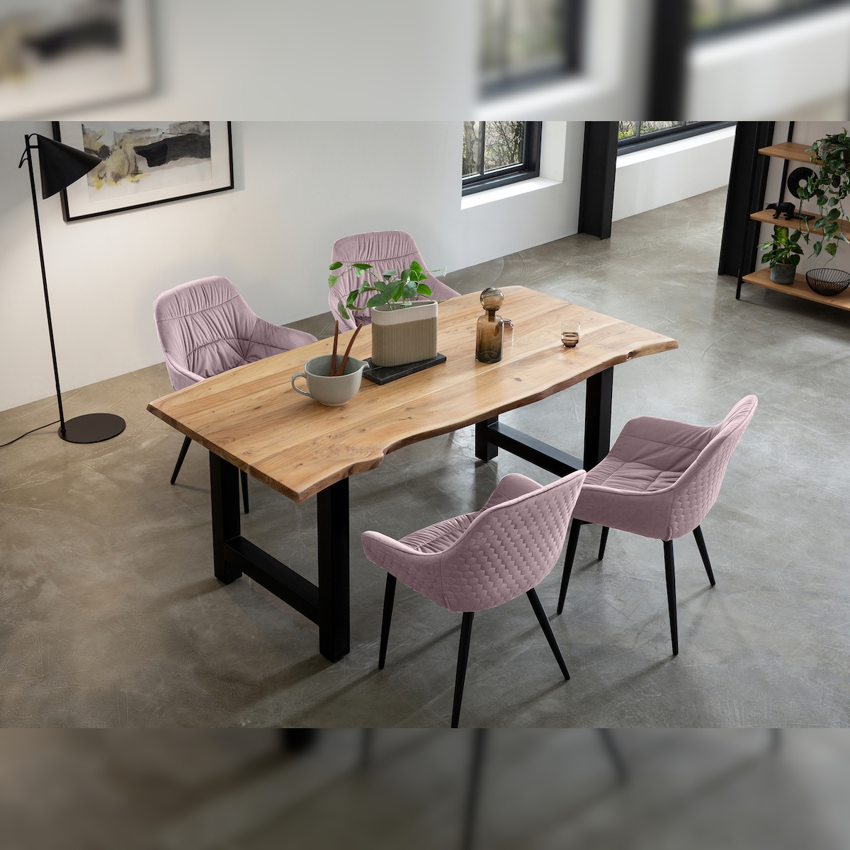SalesFever Tischgruppe 160 x 85 cm | 5-tlg. | 35 mm Platte Akazie natur | H-Gestell Metall schwarz | 4 Stühle aus Samt | rose – schwarz