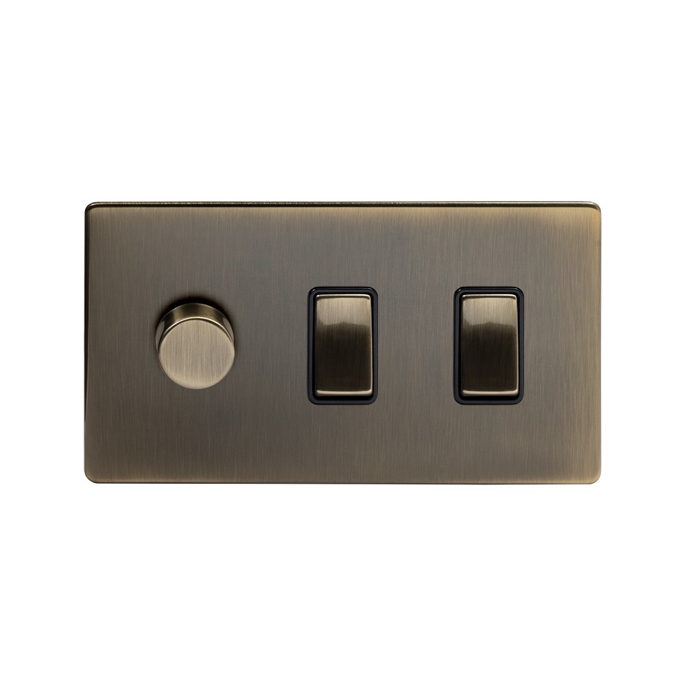 Soho Lighting Antique Brass 3 Gang Dimmer and Rocker Switch Combo (2 -Way Intelligent Dimmer & 2 x 2-Way Light Switch) - Size: H 86mm X W 146mm X D 4