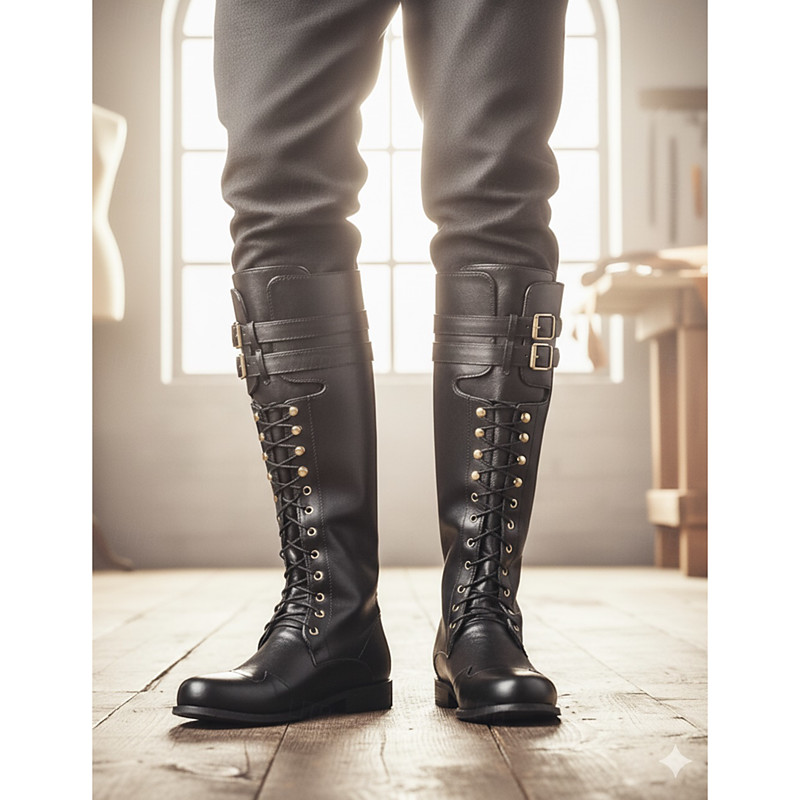Men's Black Lace-Up Knee-High Boots with Buckle Straps – Vintage-Style Military Combat Boots for Outdoor and Casual Wear