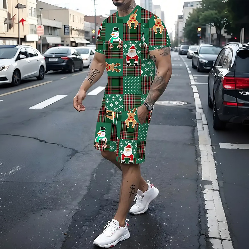 Christmas Men's Graphic 2pcs Tees sets Summer Tops Short Sleeve Short Pants Crew Neck Sport Casual Sport Casual Festival Outfit 3D Print Summer Green
