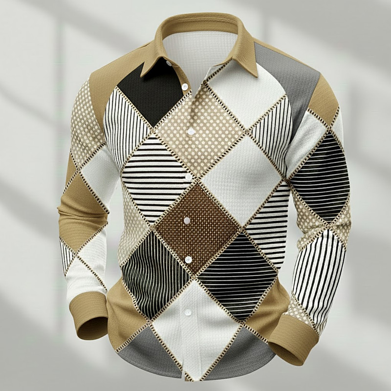 Men's Geometric Color Block Patchwork Shirt Waffle Shirt Casual Shirt Long Sleeve Fashion Casual Dailywear Holiday Summer Spring Turndown 3D Print Textured Button Up Shirts Brown Khaki Gray