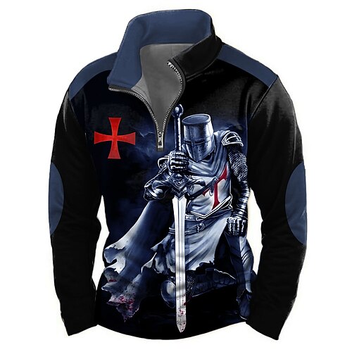 Per uomo Cavalieri Templari Felpa Casual Manica Lunga Collo alla coreana Feste Club Rosso Blu Grigio Stampa 3D Zip a un quarto Autunno Inverno progettista S M L XL XXL 3XL