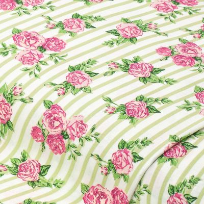 Tissu coton "roses et rayures", blanc/vert