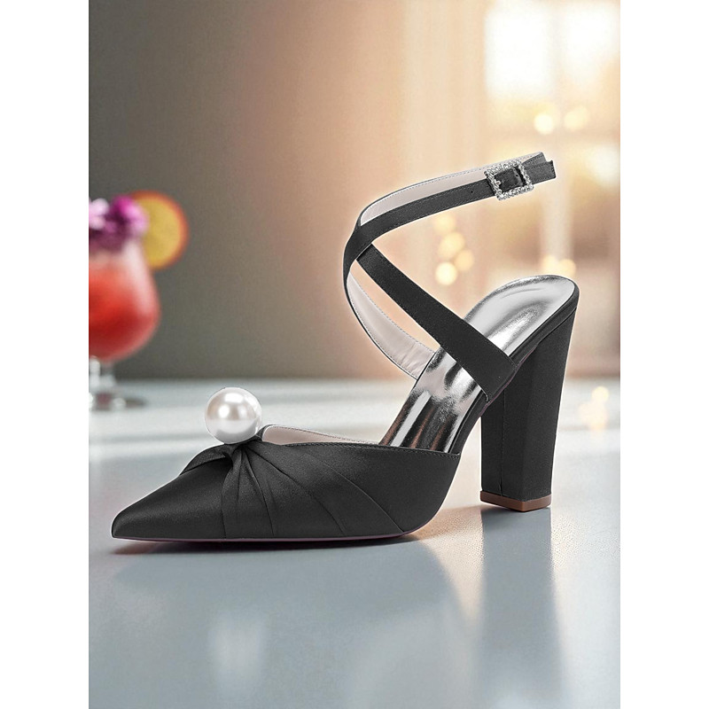 Women's Blue Satin Block Heel Pumps with Pearl Detail and Ankle Strap - Elegant Pointed Toe Shoes for Formal Occasions and Cocktail Parties