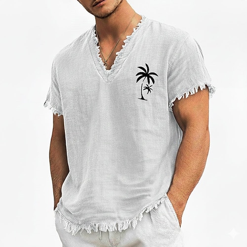 Herren-T-Shirt mit Palmenprint aus Leinen-Baumwoll-Mischgewebe, V-Ausschnitt, offene Kanten, kurze Ärmel, ausgefranst, weich, lässig, Designer-Top, Größen S-3XL