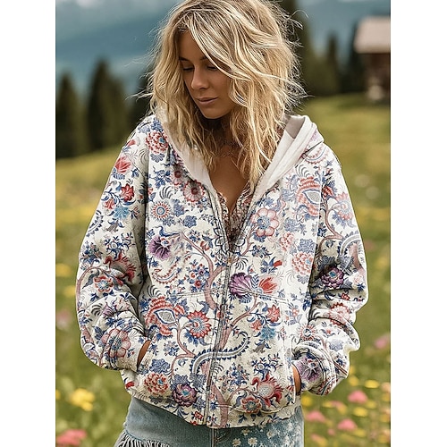 Womens 3D Druck Vintage Boho Kapuzenpullover Patchwork Kapuzenpullover Sweatshirt Floral Reißverschluss Geometrische Mode Casual Langarm Kapuze Street Alltagsmode Reißverschlusstasche Print Weiß Rot