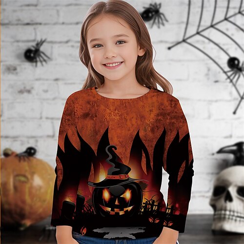 Halloween Mädchen 3D Kürbis T-Shirt Langarm Frühling Herbst Mode Basic Kinder 4-12 Jahre Rundhalsausschnitt Outdoor Lässig Täglich Normale Passform