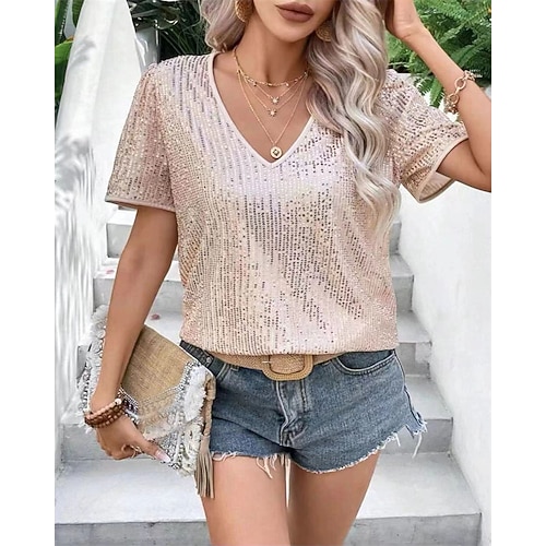 Per donna Maglietta Top estivi Tinta unica Elegante Moda Sexy Manica Corta Girocollo Scollo a V Top Regolari Quotidiano Uscire Weekend Paillettes Patchwork Nero Bianco Bianco sporco Estate Primavera