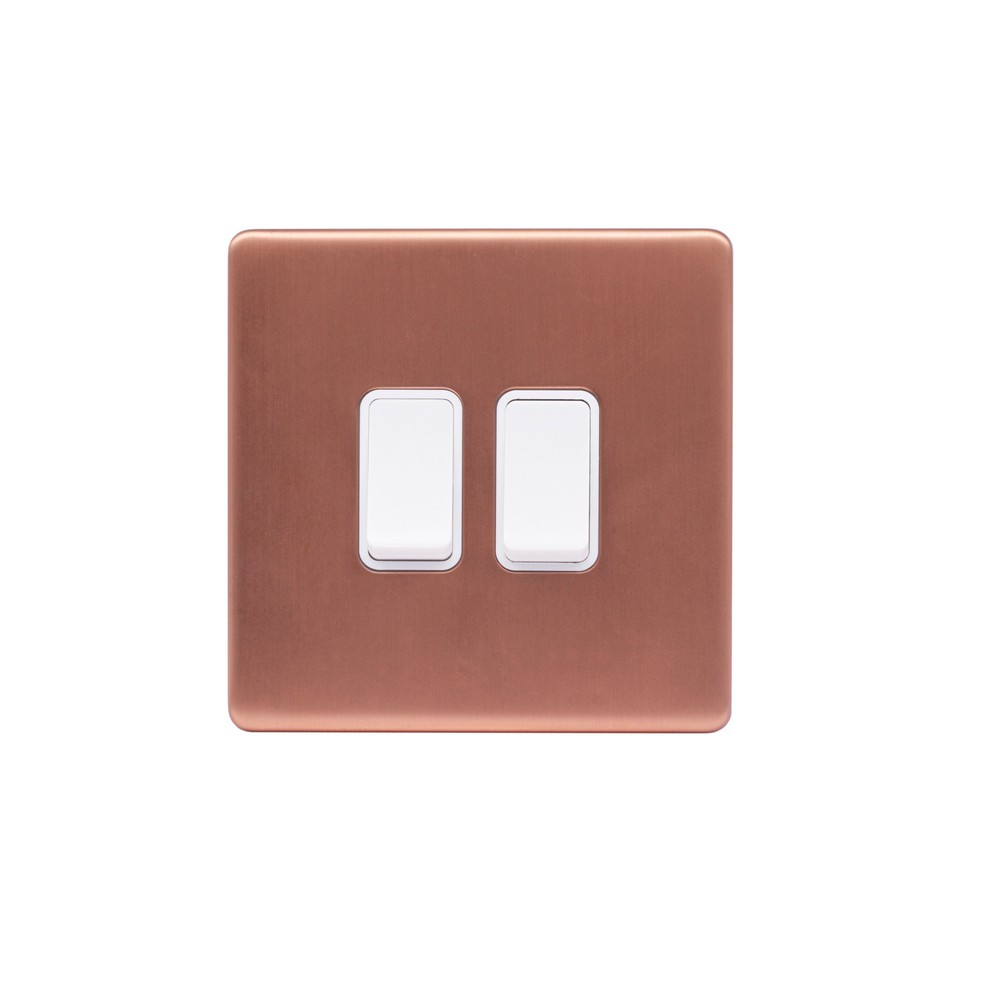 Lieber Brushed Copper 10A 2 Gang 2 Way Switch - White Insert Screwless - Size: 86mm x 86mm x 2 mm