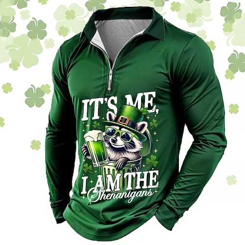 St. Patrick's Day Herren Text Poloshirts mit Reißverschluss Langarm Polo-Shirts Revers Lässig Outdoor Festival-Outfit 3D-Druck Frühling Herbst Winter Schwarz Hellgrün Grün