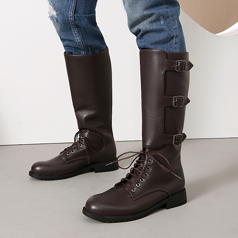 Women's Brown Knee-High Lace-Up Boots – Vintage Style Faux Leather Riding Boots for Fall and Winter