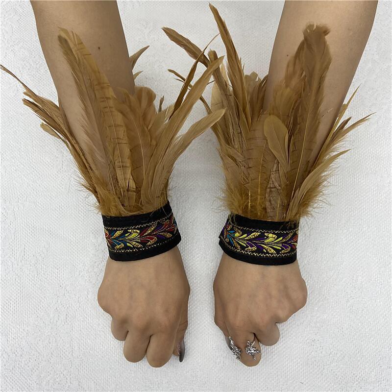 Women's Black Feather Wrist Cuffs with Vintage Embroidered Ribbon, Boho Tribal Feather Bracelets, Gypsy Hippie Costume Accessories