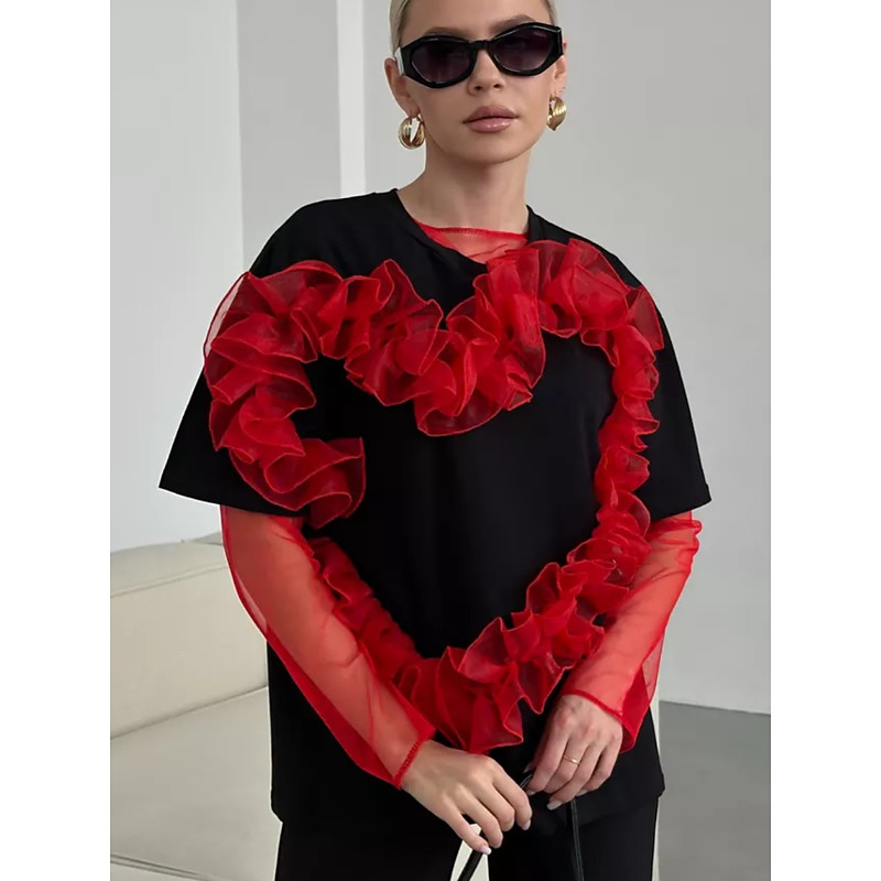 Women's T Shirt Heart Fashion Stylish Classic Short Sleeve Crew Neck Round Neck Regular Tops Daily Going out Weekend Ruched Patchwork 3D Appliques Black and White Black and Red White / Black White Red