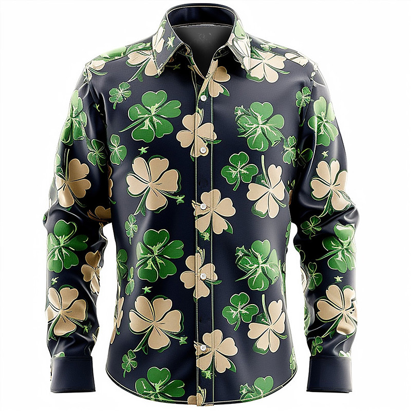 Four Leaf Clover Men's Fashion Casual 3D Printed Shirt Holiday Vacation Festival Spring Summer Turndown Long Sleeve Red Dark Green Purple S M L 4-Way Stretch Fabric Shirt St. Patrick