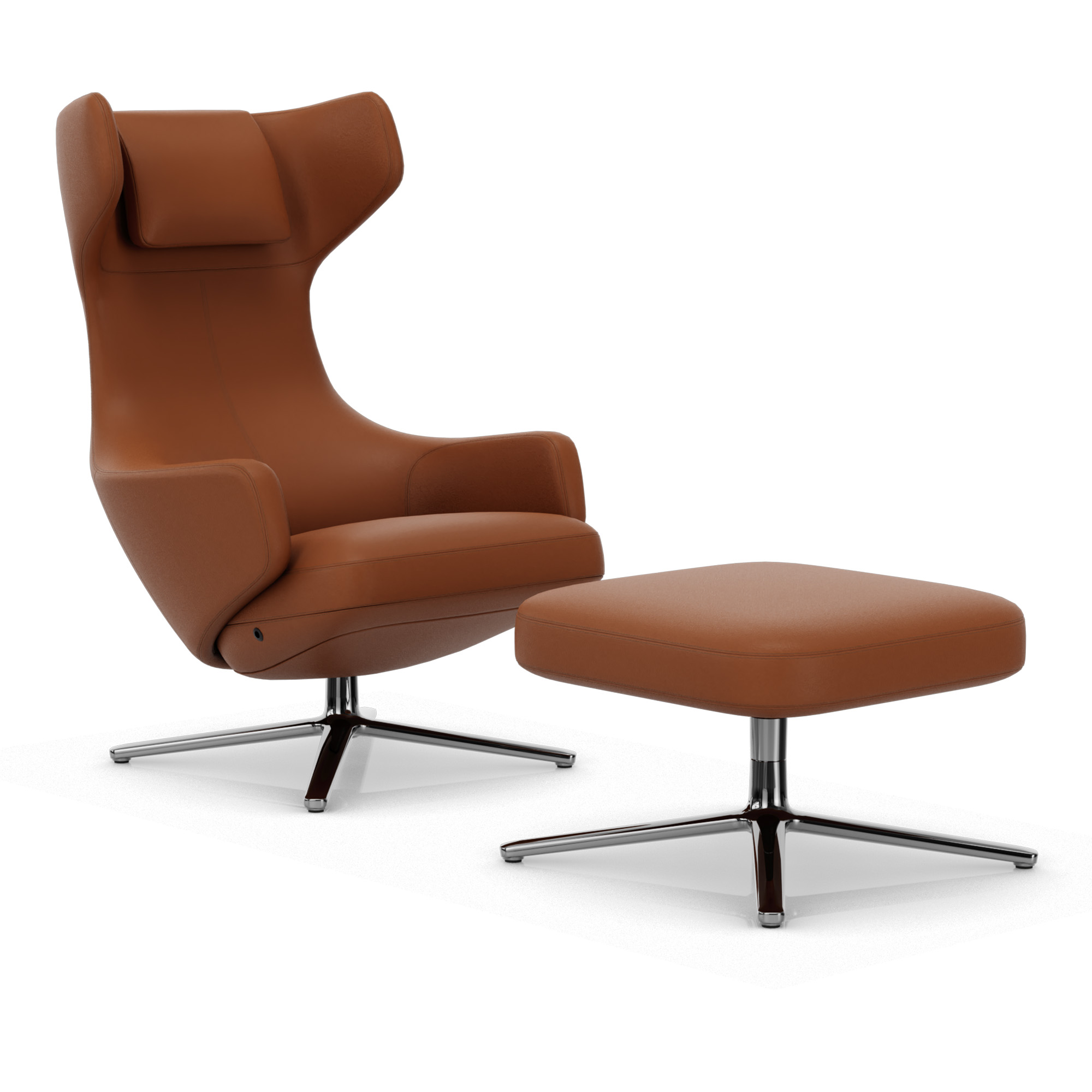 Vitra - Grand Relax + Ottoman Low, Aluminium Polished Base, Back/Seat Leather Premium Cognac, Felt Glides For Hard Floor - Snurrfåtöljer - Antonio Citterio - Brun - Dun/MDF/Läder/Metall/Syntetiskt/Skum
