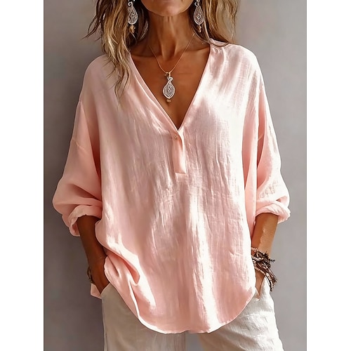 Per donna Attivo Moda Camicie di cotone e lino Misto cotone Blusa Manica Lunga Scollo a V Tinta unica All'aperto Weekend Nero Bianco Rosa Estate Vestibilità regolare