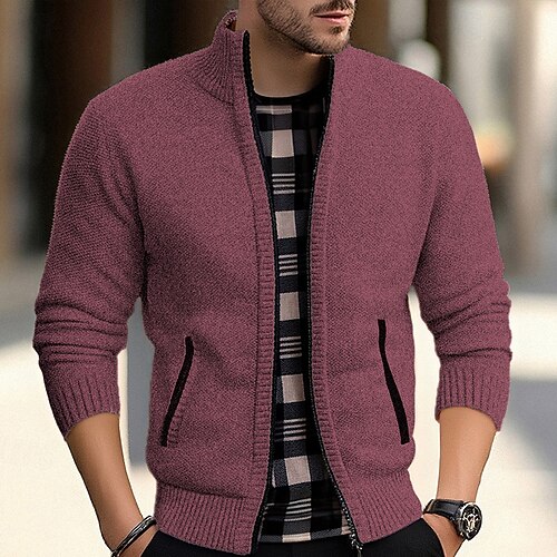 Per uomo Felpa Cardigan Maglione con Zip A Coste Maglia Top Regolari Lavorato a maglia Tinta unica Collo Alto Neutro Moda Casuale Abbigliamento quotidiano Abbigliamento Autunno Inverno Nero Borgogna