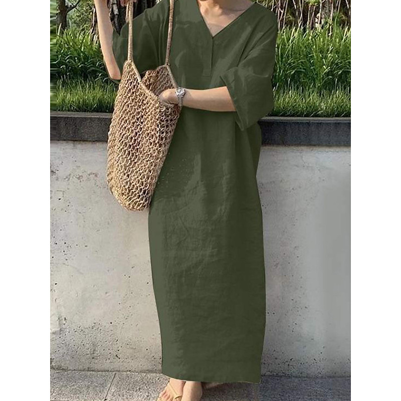 Women's Maxi Dress Cotton Linen Dresses Casual Dress Basic Casual Vacation Daily Date Regular Fit Plain Short Sleeve V Neck Khaki Army Green Dark Blue Gray Summer