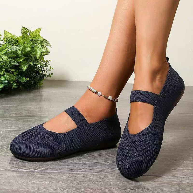 Women's Breathable Knit Fabric Mary Jane Flats – Comfortable Elastic Strap Slip-On Ballet Shoes for Daily Wear