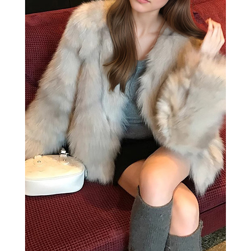 Women's Winter Coat Faux Fur Coat Warm Comfortable Buttons Cropped Casual Plain Vacation Daily Wear Going out Weekend Regular V Neck Loose Fit Long Sleeve Outerwear Gray Fall Winter