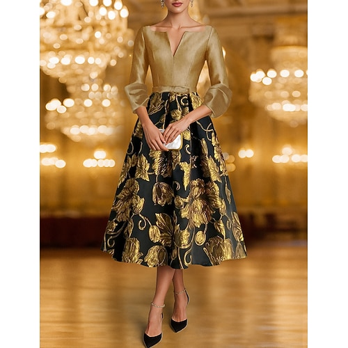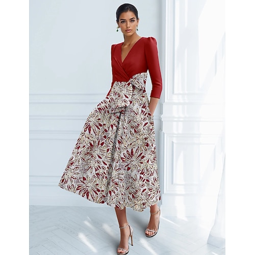 Linea ad A Lunghezza Tè Abito da Cocktail Abito da invitata a nozze Abito da cerimonia per signora Manica 3/4 Scollo a V Elegante Semplice Casual Formale Raso Elasticizzato con Pieghe Stampa
