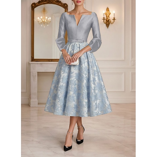 Linea ad A Lunghezza Tè Abiti da Cocktail Abiti da festa Elegante Vintage Manica 3/4 Scollo a V Matrimonio Formale Taffetà Jacquard con Fiocco/Fiocchi Pieghe