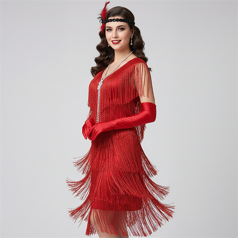 Set Roaring 20s 1920s Vintage Inspired Mini Flapper Dress Outfits Party Costume with Accessories Sleeveless The Great Gatsby Wedding Guest Tassel Fringe Solid Color Tassel V Neck Fancy Dress Women's