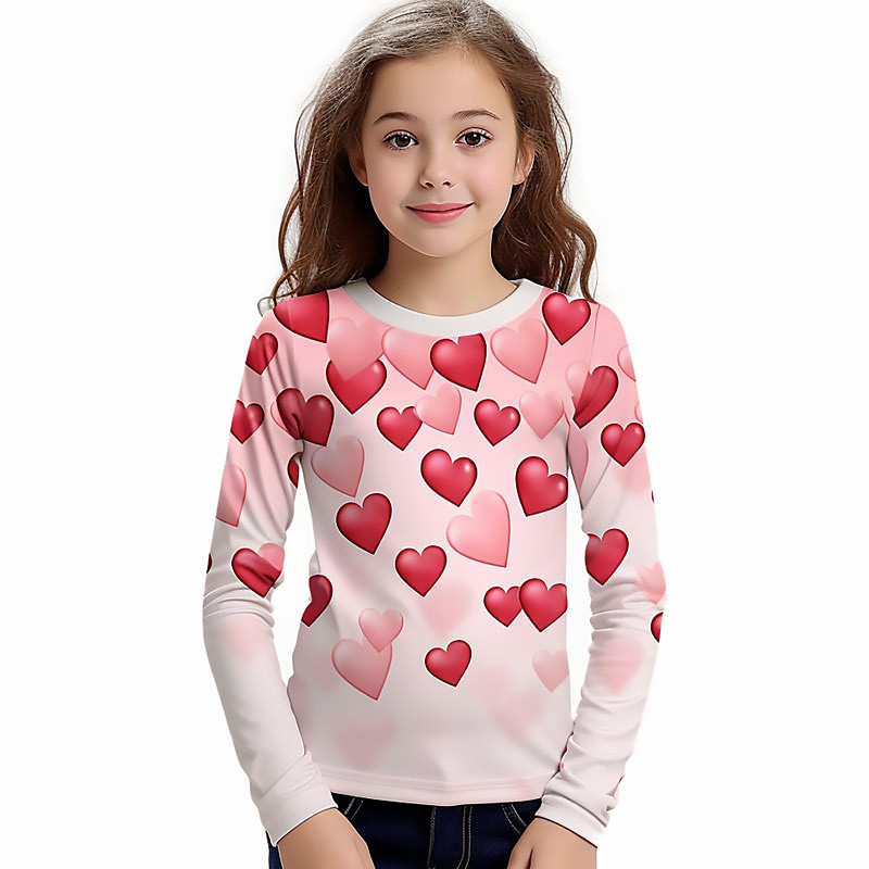 Valentines Girls' 3D Heart Tee Shirts Pink Long Sleeve 3D Print Fall Winter Active Fashion Cute Polyester Kids 3-12 Years Crew Neck Outdoor Casual Daily Regular Fit