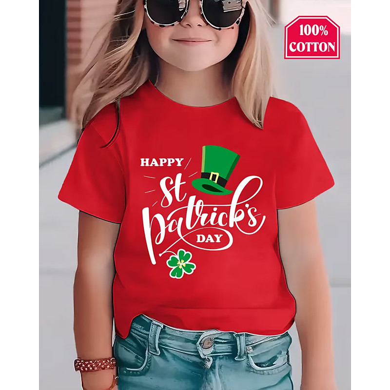 Cotton St. Patrick Kids Girls' Black White Red Graphic Hat Shamrock T shirt Tee Crew Neck Short Sleeve Daily Outdoor Vacation Vacation Fashion Casual Printing Summer