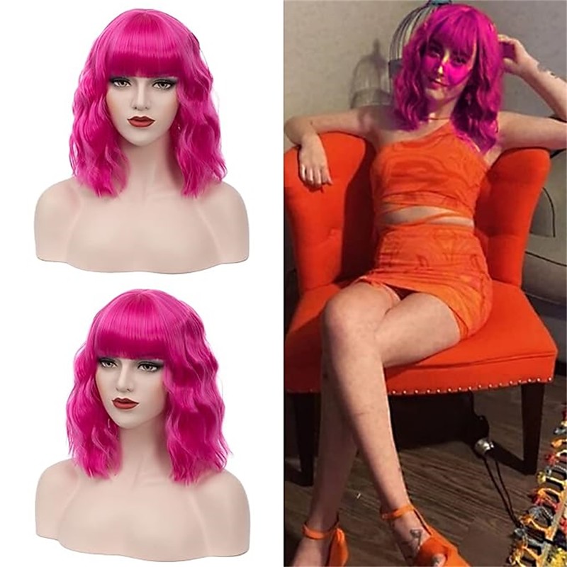 Short Bob Wigs with Bangs for Women Loose Wavy Wig Curly Wavy Shoulder Length Bob Synthetic Cosplay Wig for Girl Colorful Costume Wigs