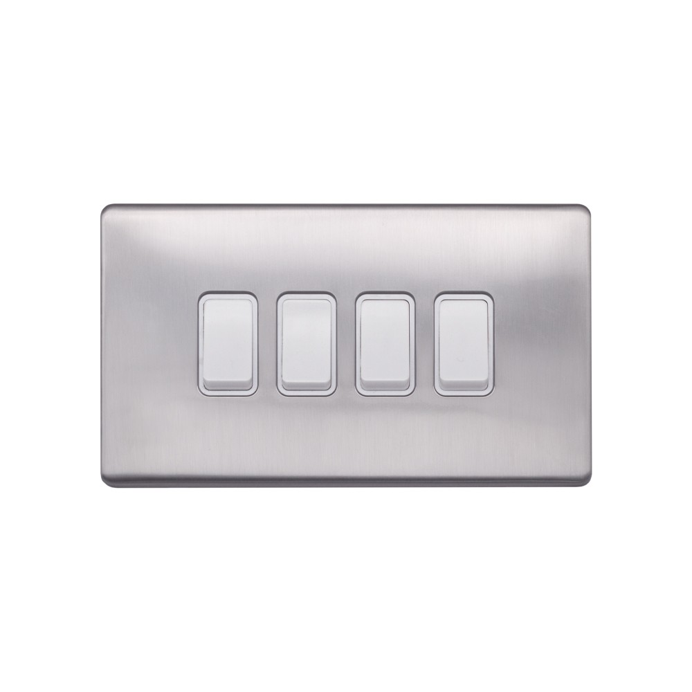 Lieber Brushed Chrome 10A 4 Gang 2 Way Switch - White Insert Screwless - Size: 146mm x 86mm x 2 mm