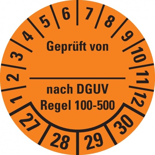 Dreifke® Prüfplakette Gepr.v...DGUV Regel 100-500 27-30,orange,Dokufolie,Ø30mm,18 St/Bogen