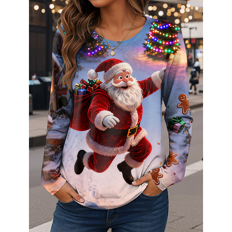 Christmas Women's T Shirt Graphic Claus Vintage Fashion Stylish Long Sleeve Crew Neck Regular Tops Daily Weekend Print Red Blue Dusty Blue Fall Winter