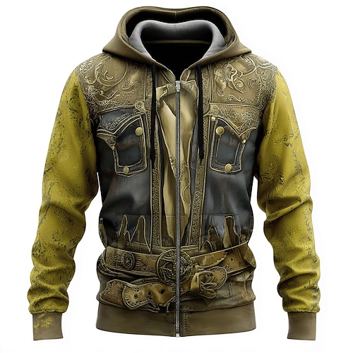 Per uomo Cowboy Costume Felpa con Cappuccio Giacca di pelle Felpa Cowboy Western Stampa su tutta la superficie Manica Lunga Con cerniera Vacanza Abbigliamento casual alla moda Marrone Verde Cachi