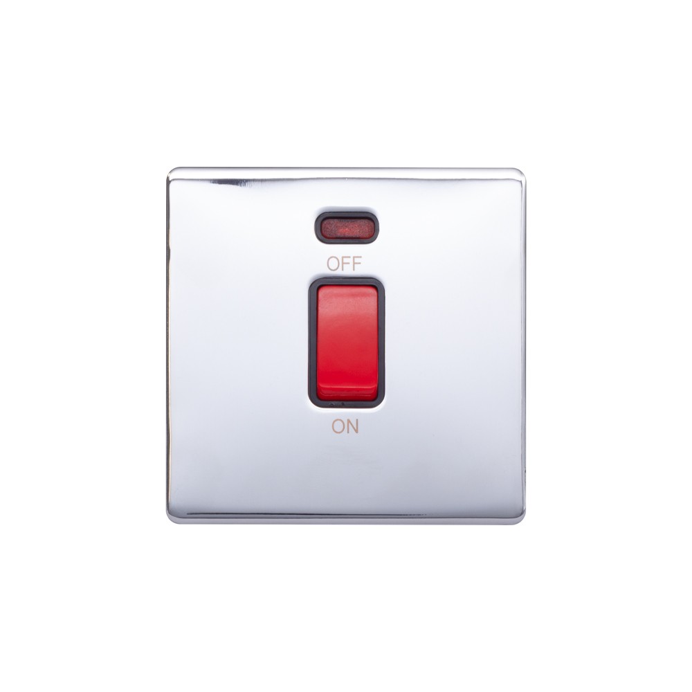 Lieber Polished Chrome 45A 1 Gang Double Pole Switch - Single Plate - Black Insert Screwless - Size: 86mm x 86mm x 3.1 mm